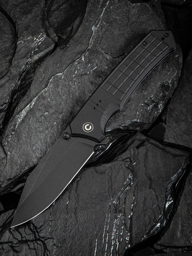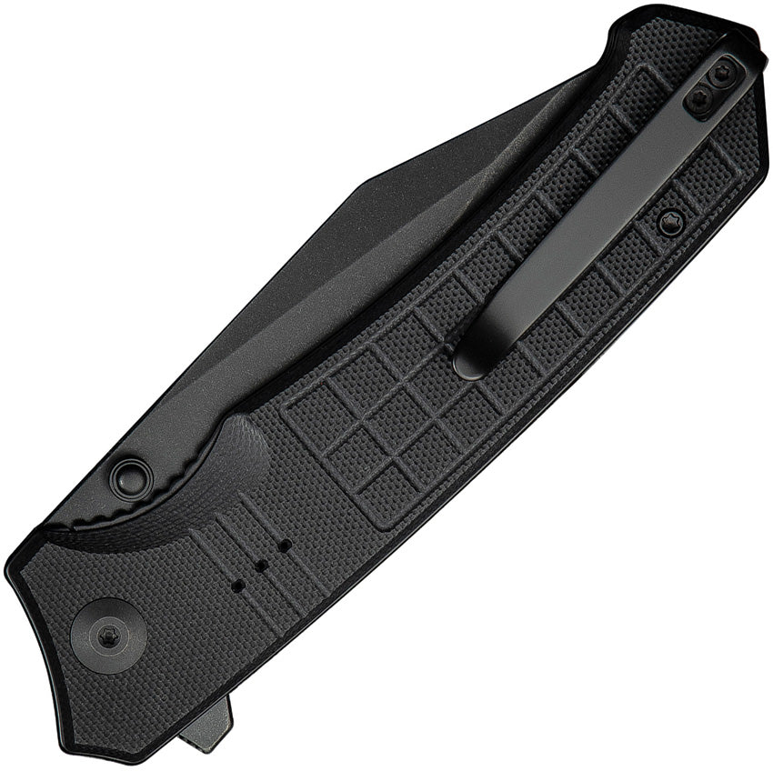 4.75" (12.07cm) closed. 3.75" (9.53cm) black stonewash finish Nitro V steel clip point blade. Black G10 handle. Extended tang. Thumb stud. Pocket clip. Black nylon zippered storage case. Boxed.