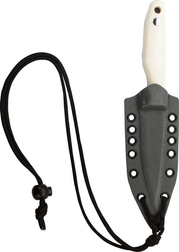8.38" (21.29cm) overall. 4.13" (10.49cm) natural finish Scandi grind 1095HC steel blade. White micarta handle. Full tang. Lanyard hole. Black Kydex belt sheath. Boxed.