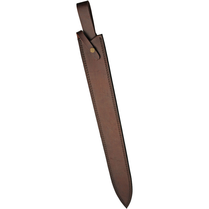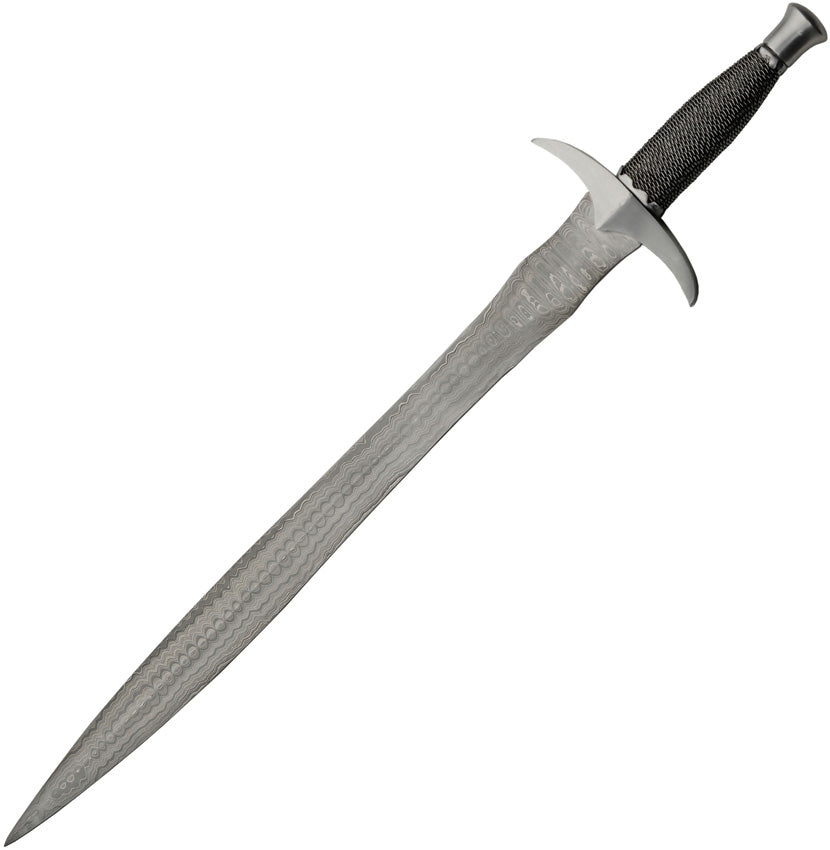 29" (73.66cm) overall. 23" (58.42cm) double edge Damascus steel blade. Black wire wrapped handle. Steel guard and pommel. Fuller groove. Brown leather belt sheath. Boxed.