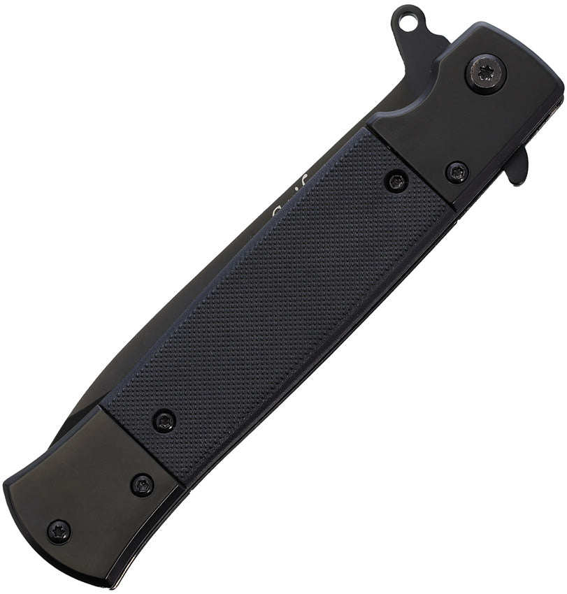 Assisted opening. 4.75" (12.07cm) closed. 3.75" (9.53cm) black stonewash finish 420C stainless stiletto style blade. Black stainless handle with black G10 inlay. Extended tang. Pocket clip. Boxed.