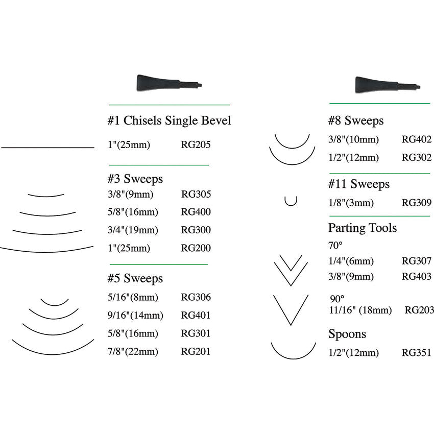 14 Piece Set includes: RG305 #3 x 3/8; RG400 #3 x 5/8; RG300 #3 x 3/4; RG200 #3 x 1; RG306 #5 x 5/16; RG401 #5 x 9/16; RG301 #5 x 5/8; RG201 #5 x 7/8; RG402 #8 x 3/8; RG302 #8 x 1/2; RG309 #11 x 1/8; RG307 70 deg. X 1/4; RG403 70 deg. X 3/8; RG203 90 deg. X 11/16. Ideal for roughing out and detailing. Compatible with most reciprocating power tools, and requires no adapters for the following machines: Proxxon; Foredom; Wecheer; Ryobi and MasterCarver. Storage case.