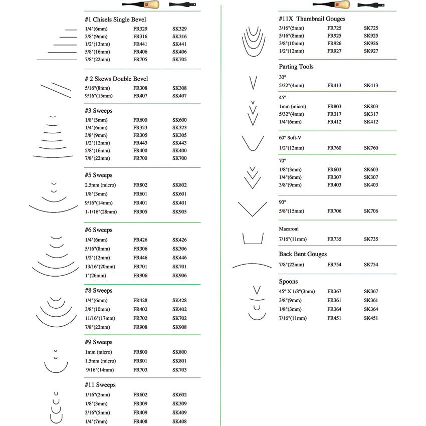 Relief printing is based on a reductive process - carve the non-image away from a flat, level surface and ink the remaining top surface with a roller or brayer in order to print the image. Set contains 4 carving blades, a quick-connect ABS handle, 11-pocket tool roll, as well as a custom strop and polishing compound. Profiles included: SK306 #6 x 5/16"; SK309 #11 x 1/8"; SK803 45 deg. x 1mm; and SK307 70 deg. x 1/4". Hang packaged.