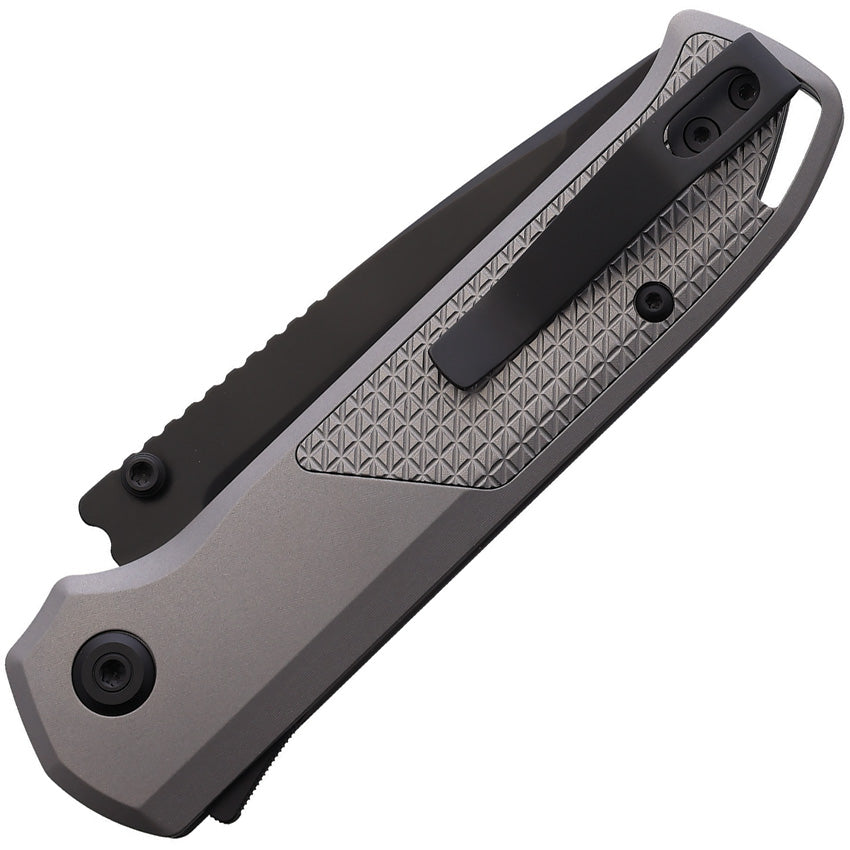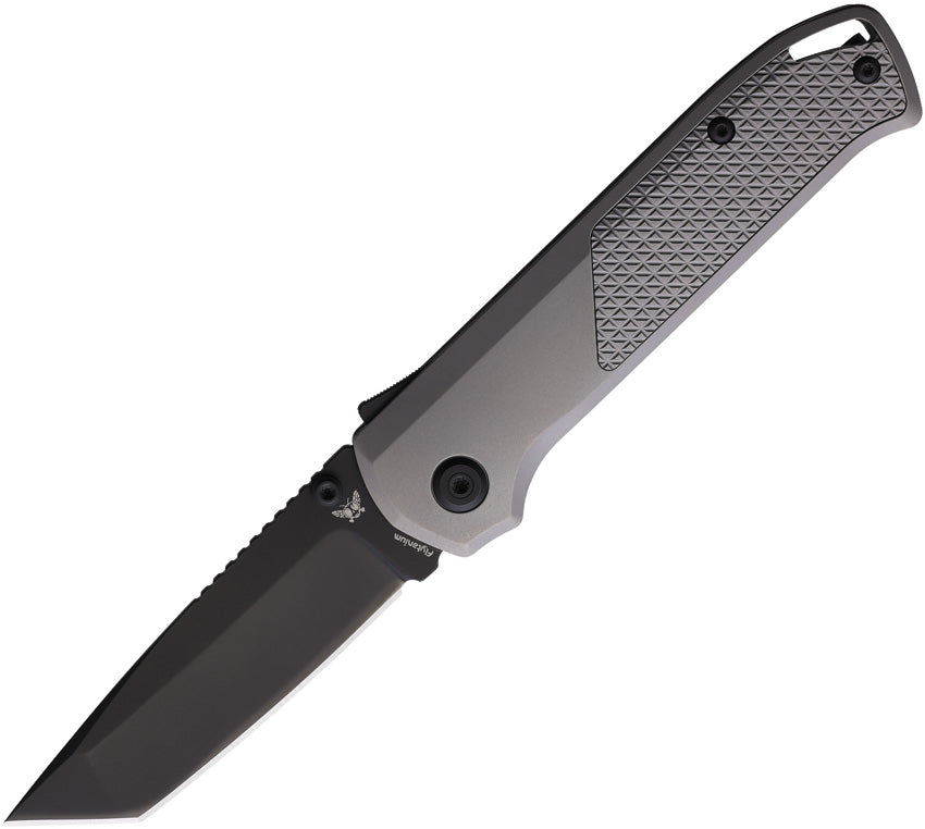 4.5" (11.43cm) closed. 3.25" (8.26cm) black DLC coated CPM-20CV stainless tanto blade. Gray textured titanium handle. Thumb stud. Lanyard hole. Pocket clip. Demko Knives Shark-Lock Technology. Compatible with Benchmade Bugout thumb studs. Boxed.