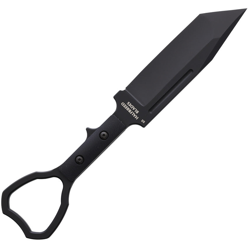 7.75" (19.69cm) overall. 4" (10.16cm) black Teflon coated Bohler K110 stainless tanto blade. One-piece construction. Finger ring. Includes red aluminum trainer that is virtually identical in weight and size to the live edge variant. Black molded plastic MOLLE compatible belt sheath. Boxed.