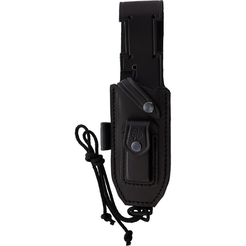 9.88" (25.1cm) overall. 5" (12.7cm) satin finish MV-58 stainless blade. Black micarta handle. Full, extended tang. Lanyard hole. Glass breaker. Black leather belt sheath.
