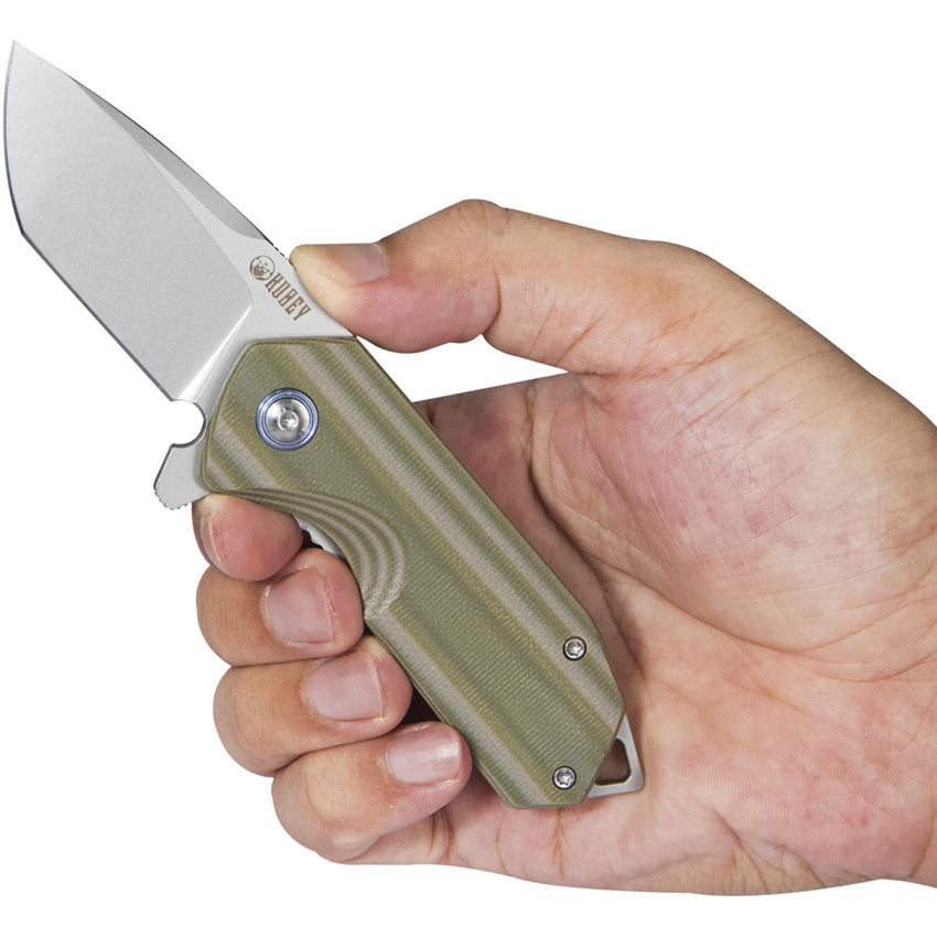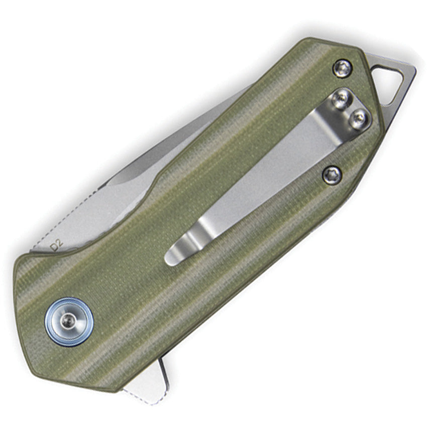 4" (10.16cm) closed. 2.75" (6.99cm) sand blast finish D2 tool steel tanto blade. Green G10 handle. Extended tang. Lanyard hole. Pocket clip. Boxed.