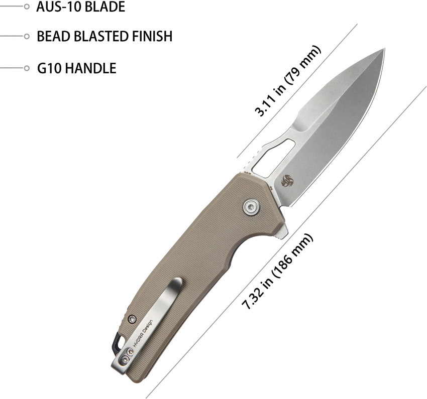 4.25" (10.8cm) closed. 3.13" (7.95cm) bead blast finish AUS-10A stainless blade. Tan G10 handle. Thumb pull. Extended tang. Lanyard hole. Pocket clip. Boxed.