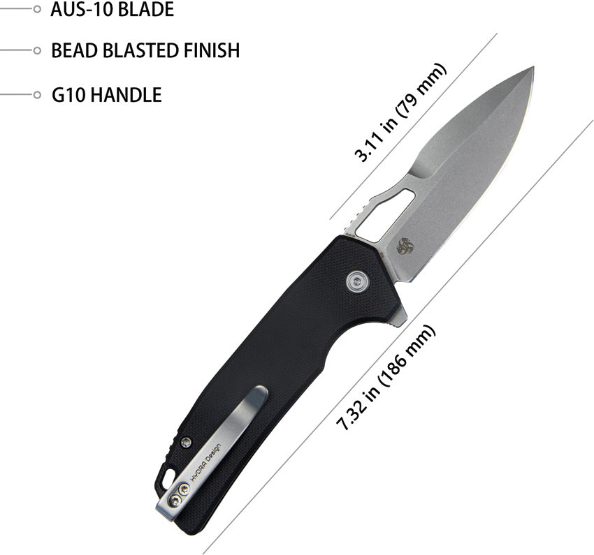 4.25" (10.8cm) closed. 3.13" (7.95cm) bead blast finish AUS-10A stainless blade. Black G10 handle. Thumb pull. Lanyard hole. Extended tang. Pocket clip. Boxed.