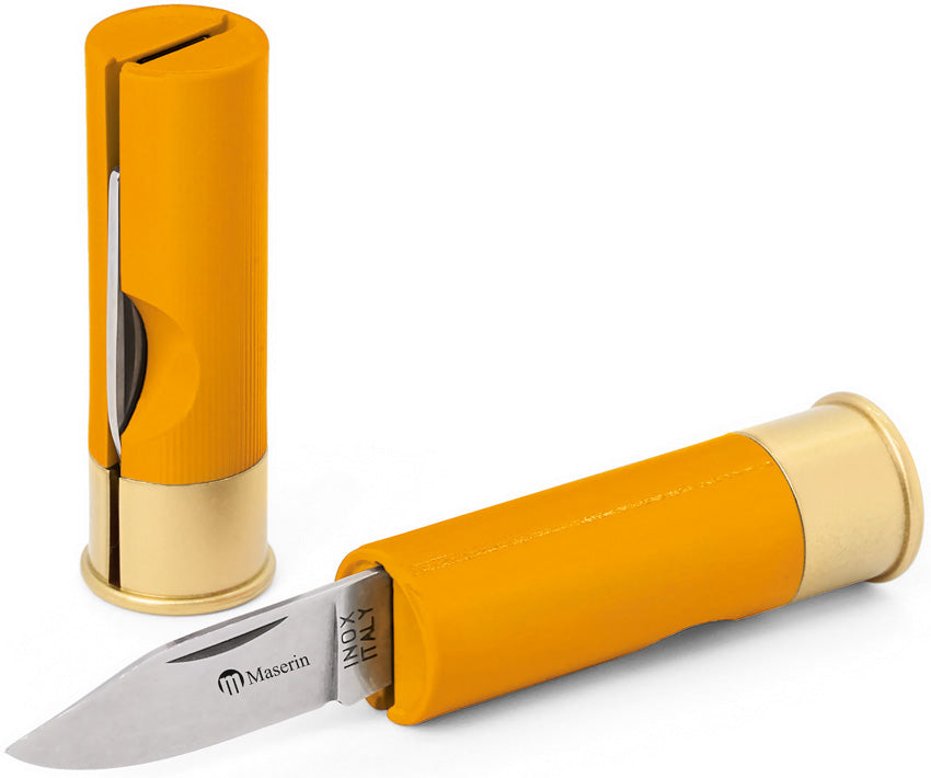 2.63" (6.68cm) closed. 1.88" (4.78cm) stainless clip point blade. Yellow plastic handle. Handle in shape of shotgun shell. Boxed.