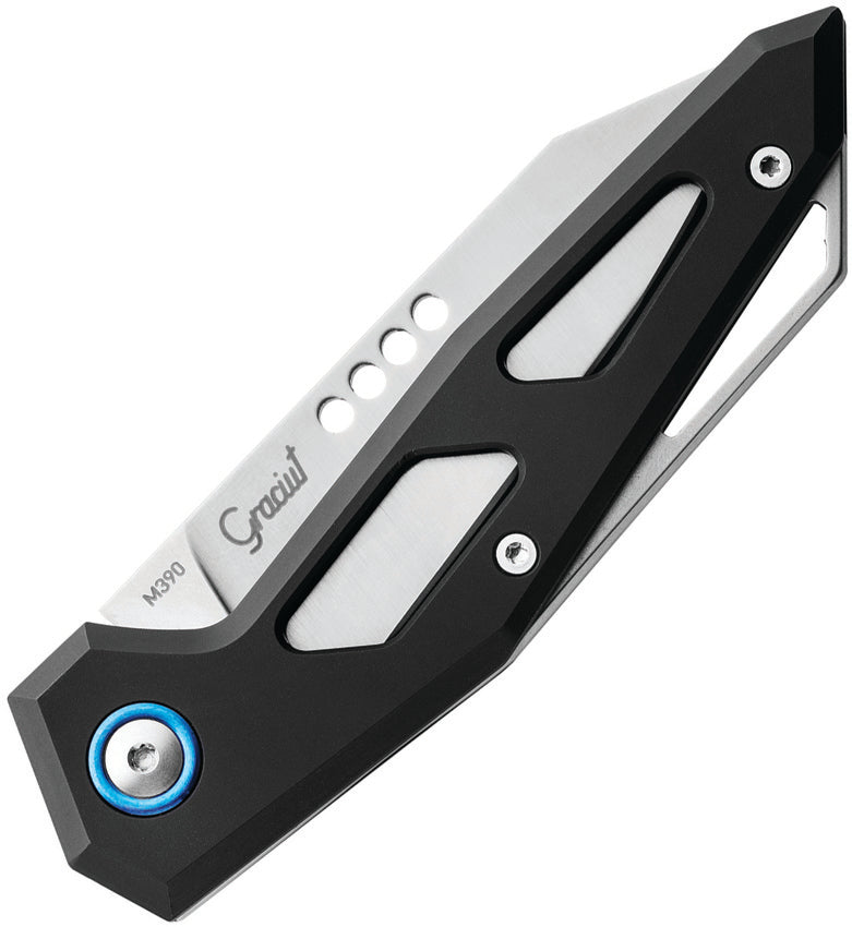 4" (10.16cm) closed. 3" (7.62cm) satin finish Bohler M390 stainless modified tanto blade. Black aluminum handle. Lanyard hole. Brown leather belt sheath. Boxed.