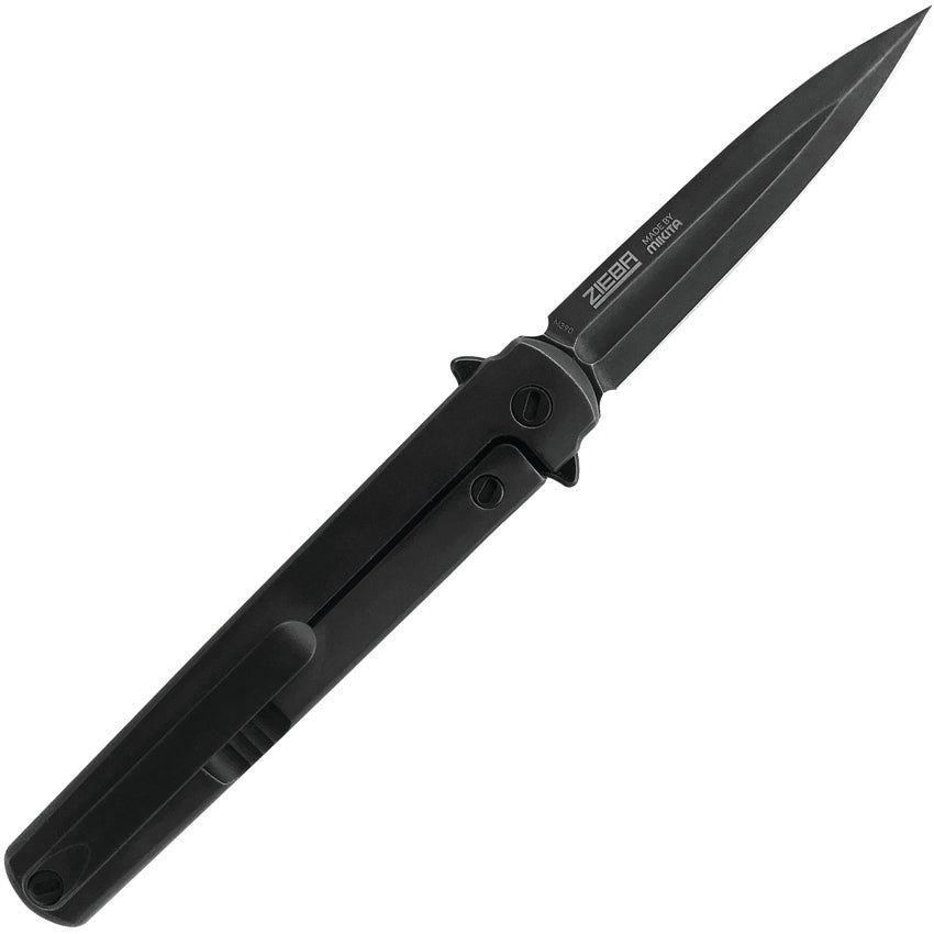 4.13" (10.49cm) closed. 2.88" (7.32cm) black PVD coated Bohler M390 stainless dagger blade. Black and red carbon fiber handle with black PVD coated titanium back handle. Extended tang. Pocket clip. Designed by Michael Zieba. Black ballistic nylon pouch. Boxed.