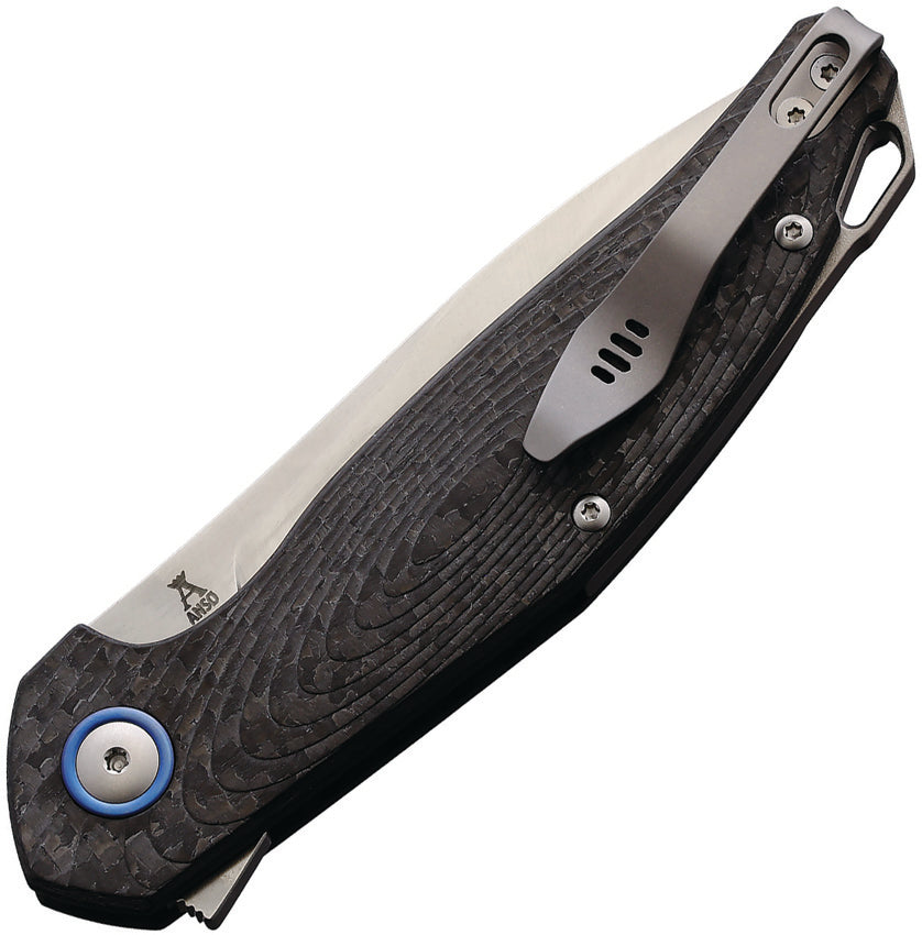 4.5" (11.43cm) closed. 3.5" (8.89cm) satin finish Bohler M390 stainless blade. Carbon fiber handle. Extended tang. Lanyard hole. Titanium sand blast finish spacer and pocket clip. Black ballistic nylon zippered storage case. Designed by Jens Anso. Boxed.