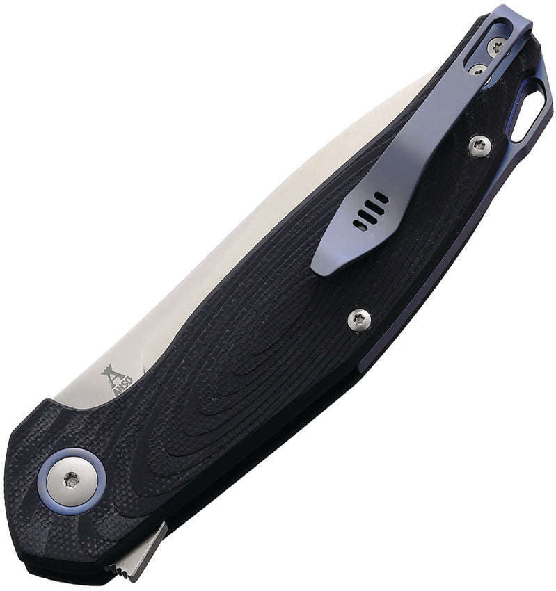 4.5" (11.43cm) closed. 3.5" (8.89cm) satin finish Bohler M390 stainless blade. Black G10 handle. Extended tang. Lanyard hole. Titanium blue spacer and pocket clip. Black ballistic nylon zippered storage case. Designed by Jens Anso. Boxed.