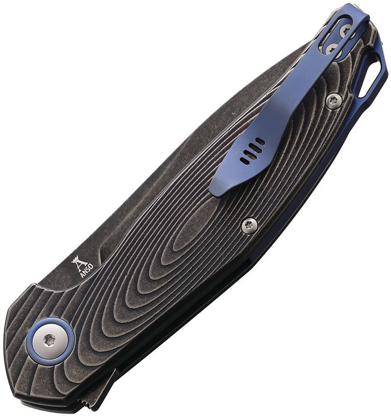 4.5" (11.43cm) closed. 3.5" (8.89cm) black stonewash finish Bohler M390 stainless blade. Black stonewash finish titanium handle. Extended tang. Lanyard hole. Blue anodized finish spacer and pocket clip. Black ballistic nylon zippered storage case. Designed by Jens Anso. Boxed.