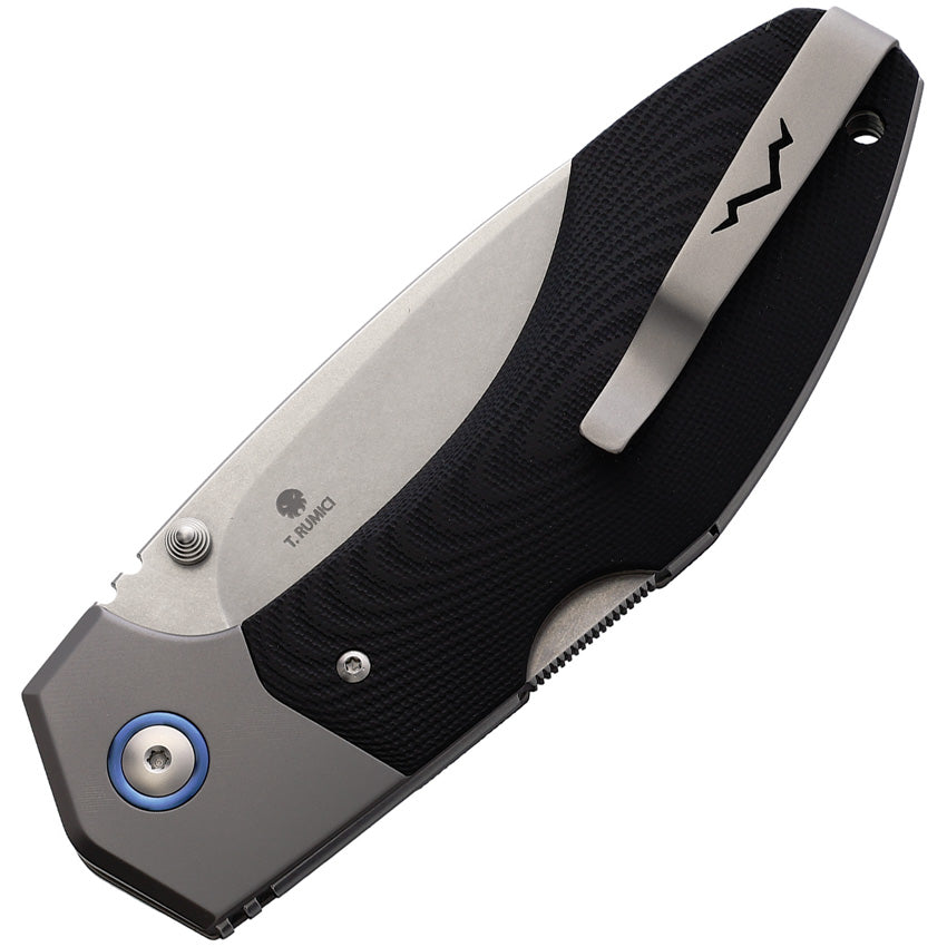 4.5" (11.43cm) closed. 3.5" (8.89cm) stonewash finish Bohler M390 stainless blade. Black G10 handle. Titanium bolster(s). Thumb stud. Lanyard hole. Pocket clip. Black nylon zippered storage case. Boxed.
