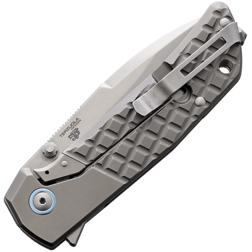 4.5" (11.43cm) closed. 3.5" (8.89cm) stonewash finish Bohler M390 stainless blade. Sand blast finish titanium handle. Extended tang. Lanyard hole. Pocket clip. Thumb stud. Black nylon zippered storage case. Boxed.