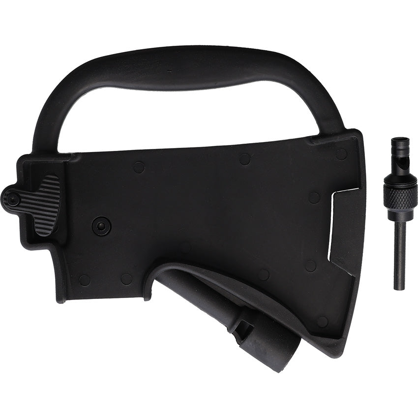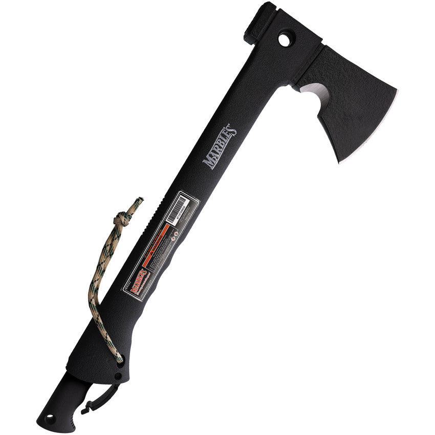 14" overall. 5.5" 3Cr13 stainless axe head with 3.25" cutting edge. Black synthetic handle. Includes ferro rod. Black synthetic sheath.