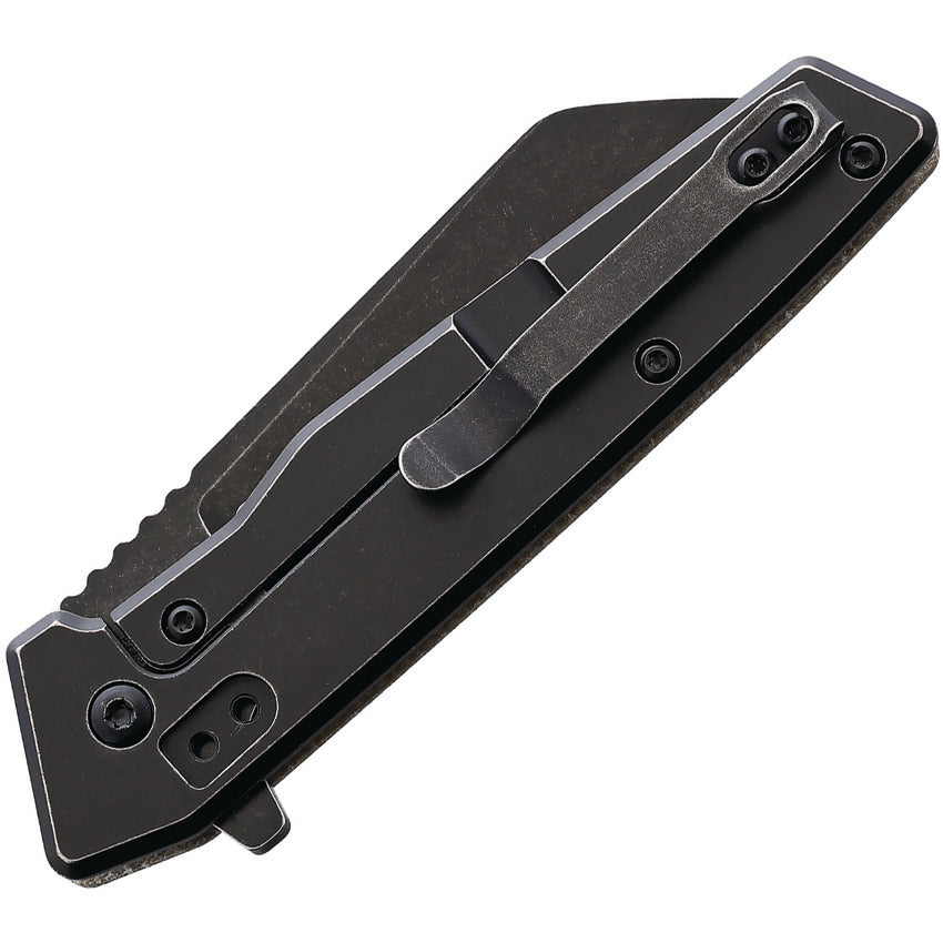 4.25" (10.8cm) closed. 3.25" (8.26cm) black stonewash finish AUS-8 stainless blade. Brown linen micarta handle with Black stonewash finish titanium back handle. Extended tang. Pocket clip.
