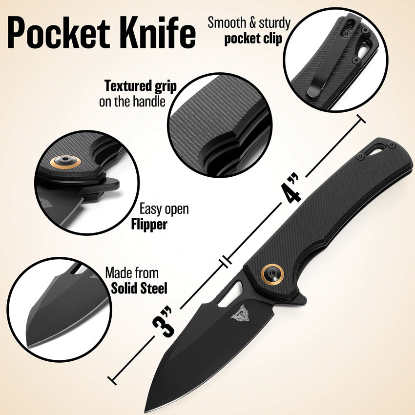 4.13" (10.49cm) closed. 3" (7.62cm) black oxide coated stainless drop point blade. Black G10 handle. Thumb pull. Lanyard hole. Pocket clip. Extended tang. Boxed.