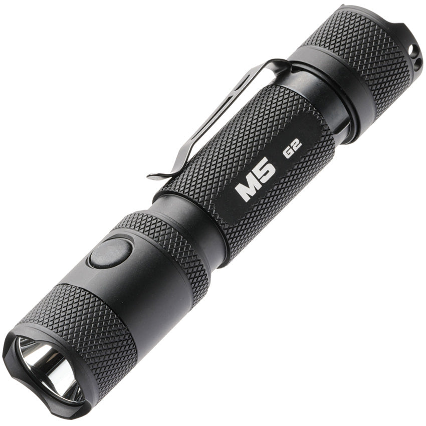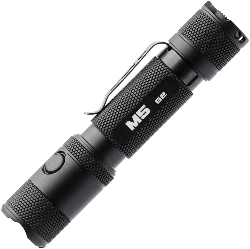 4.88" overall. Clip. Impact resistant. Rechargeable. IPX8 waterproof submersible up to 2 meters under water. Modes: Turbo (2030 lumens, 2.65h runtime); High (850 lumens, 2.9h runtime); Medium (260 lumens, 5.15h runtime); Low (65 lumens, 23.3h runtime); Firefly (0.5 lumen, 25 day runtime). Magnetic tail cap. One switch system. Low battery indicator. 330m beam distance. Requires (1) 18650 battery (included), or (2) CR123A batteries (not included). Aluminum construction. Color: Black. Boxed.