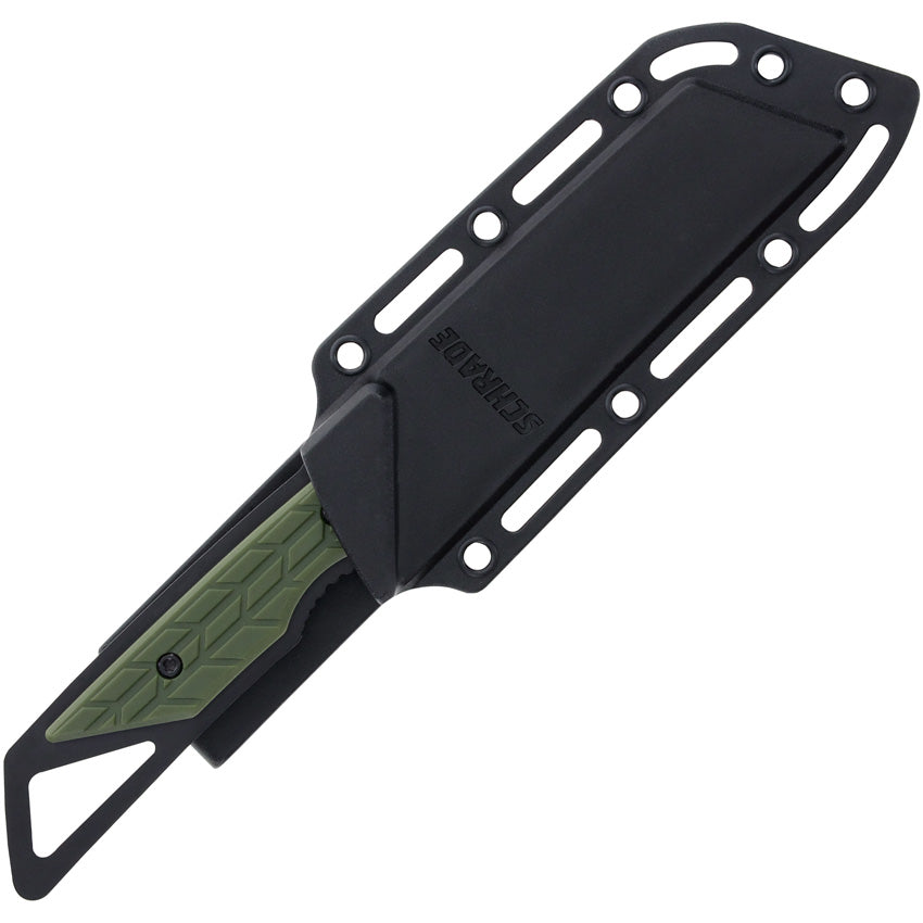 8.5" (21.59cm) overall. 3.75" (9.53cm) black oxide coated AUS-8 stainless cleaver style blade. OD green rubberized synthetic handle. Full, extended tang. Finger ring. Black injection molded belt sheath. Clam packed.