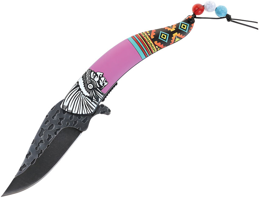 Assisted opening. 5" (12.7cm) closed. 3.5" (8.89cm) black stonewash finish stainless blade. Pink synthetic handle. Extended tang. Lanyard hole. Southwestern handle artwork. Beaded lanyard. Boxed.