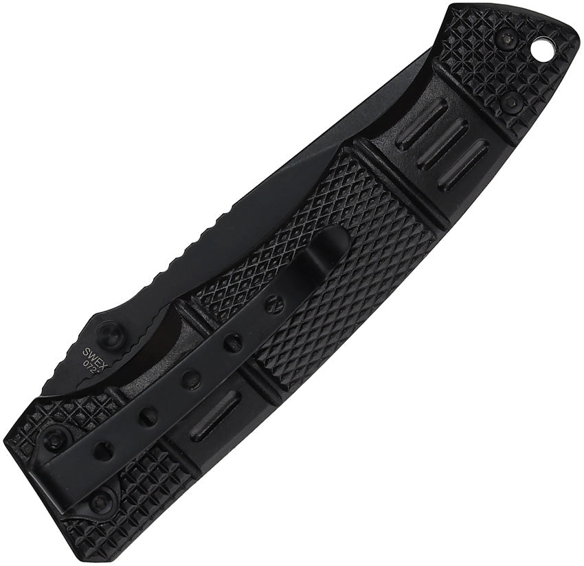 4.5" (11.43cm) closed. 3.25" (8.26cm) black oxide coated stainless blade. Black textured aluminum handle. Thumb stud. Lanyard hole. Pocket clip. Boxed.