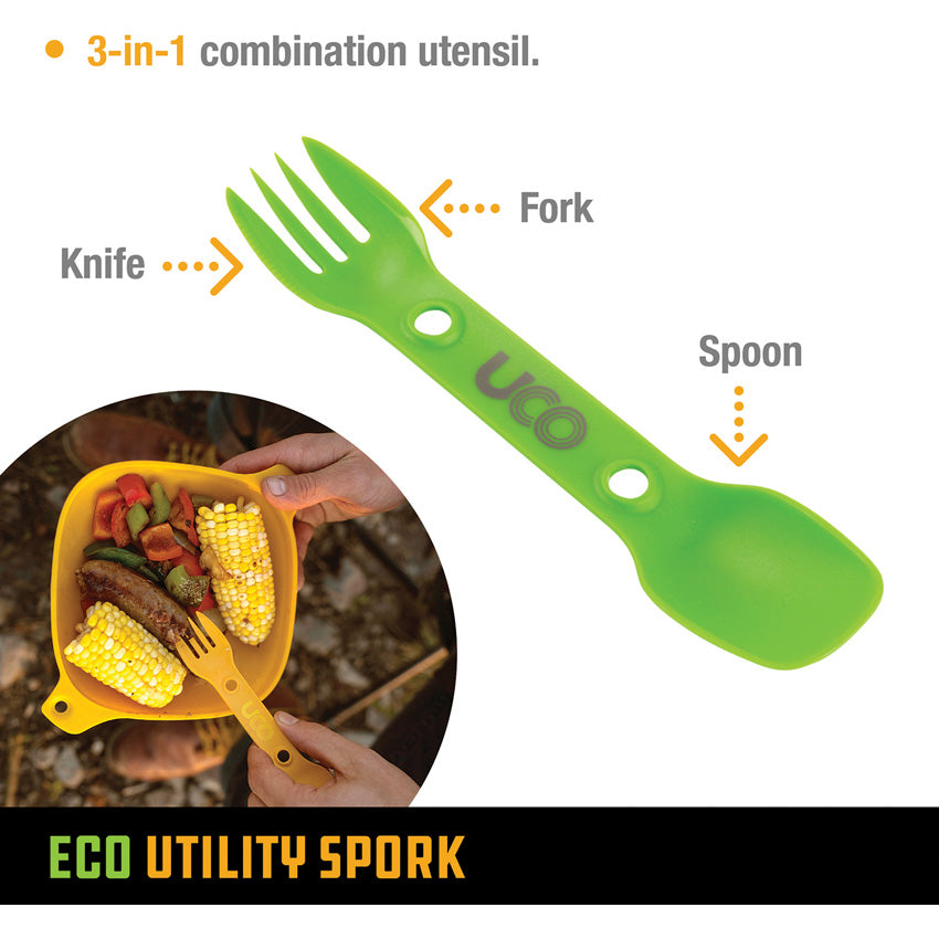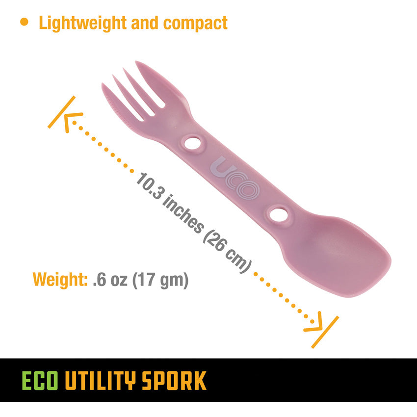 Dimensions: 7" x 1.3" x 0.75". Dishwasher safe. Three in one design delivers a fork, spoon, and serrated fork edge. Stackable, nesting design. Microwave safe. BPA and Phthalate free. Set of two (Green and Lavender). Food grade recycled polypropylene construction.