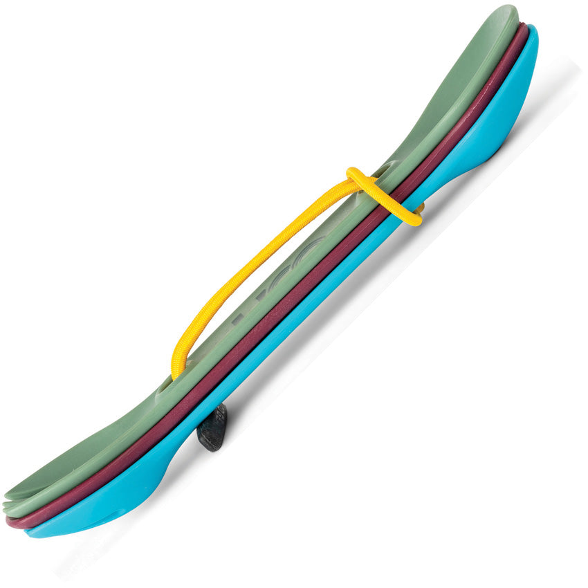 6" overall. Dishwasher safe. Pack of three. Designed for children. No sharp serrated edge on spoon and rounded edges. FDA food safe, BPA free, Phthalate free. Includes reusable tether. Color: Terra (green, purple, blue). Hang packaged.