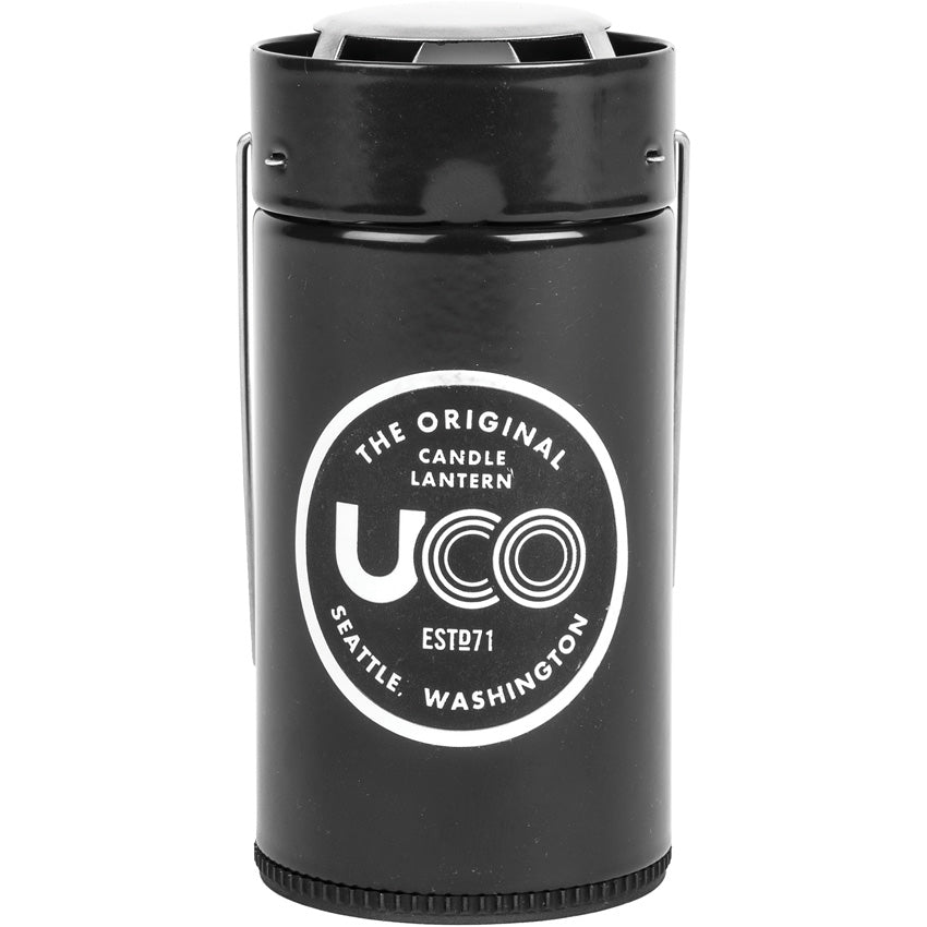 6.25" height open; 4.25" height closed. 2" diameter. Spring-loaded candle tube keeps the flame constant with a small viewing window that shows how much of the candle remains. Steel bail. Can be used with UCO 9-hour candle (included); UCO citronella candle or UCO 12-hour beeswax candle. Boxed with hanging tab.