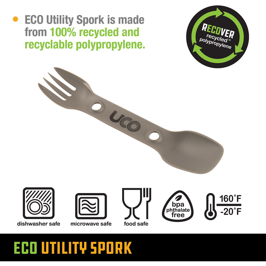 Dimensions: 7" x 1.3" x 0.75". Dishwasher safe. Three in one design delivers a fork, spoon, and serrated fork edge. Stackable, nesting design. Microwave safe. BPA and Phthalate free. Set of two (Chili and Slate). Food grade recycled polypropylene construction.