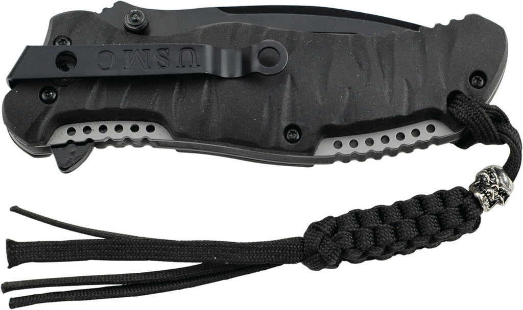 4 3/4" closed linerlock. 3 5/8 black finish 440C stainless partially serrated spear point blade with dual thumb studs and extended tang. Manual opening blade. Thick, grooved black rubberized handles with USMC inlay medallion shield. Top of handles feature a partially opened spine with a drilled hole design and ridge. Lanyard hole with black braided nylon lanyard and skull bead. Black stainless pocket clip.