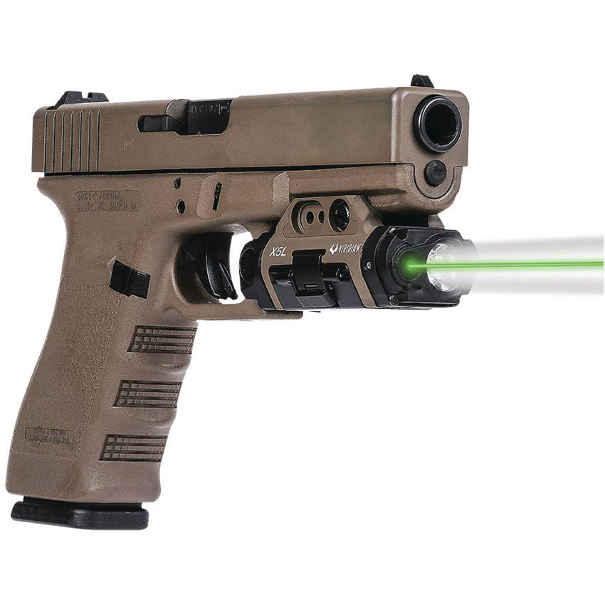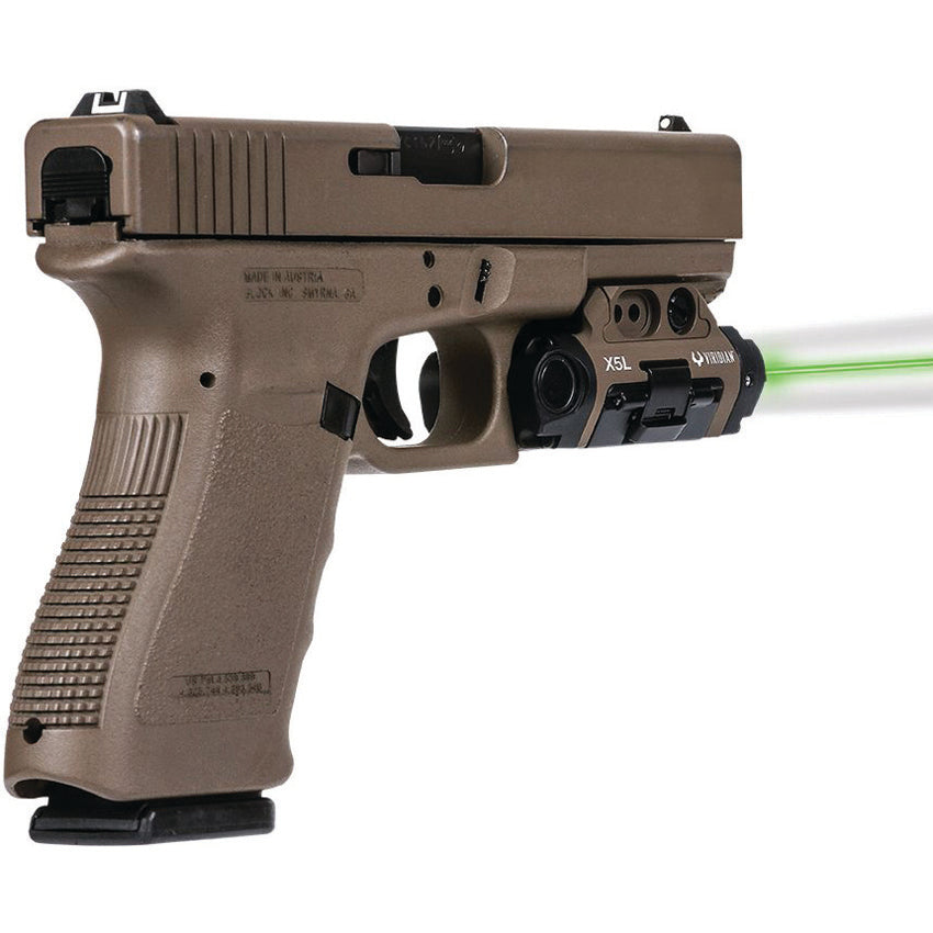Dimensions: 1.5" x 1.5". Waterproof. Shockproof. Fits most full-sized railed pistols. Fits most holsters designed for Streamlight TLR1. 5mw green laser with 100 yard range. 500 lumen CREE LED tactical light. Secure universal mounting. Instant-On activation. Six operating modes. 2.75" from trigger guard. Magpul FDE Cerakote finish. Boxed.