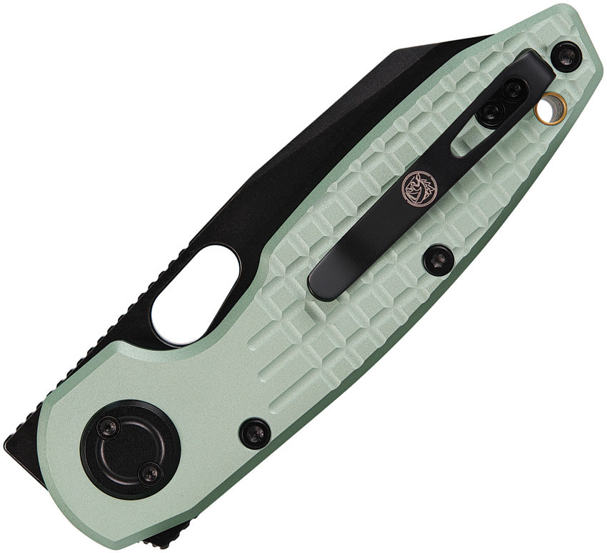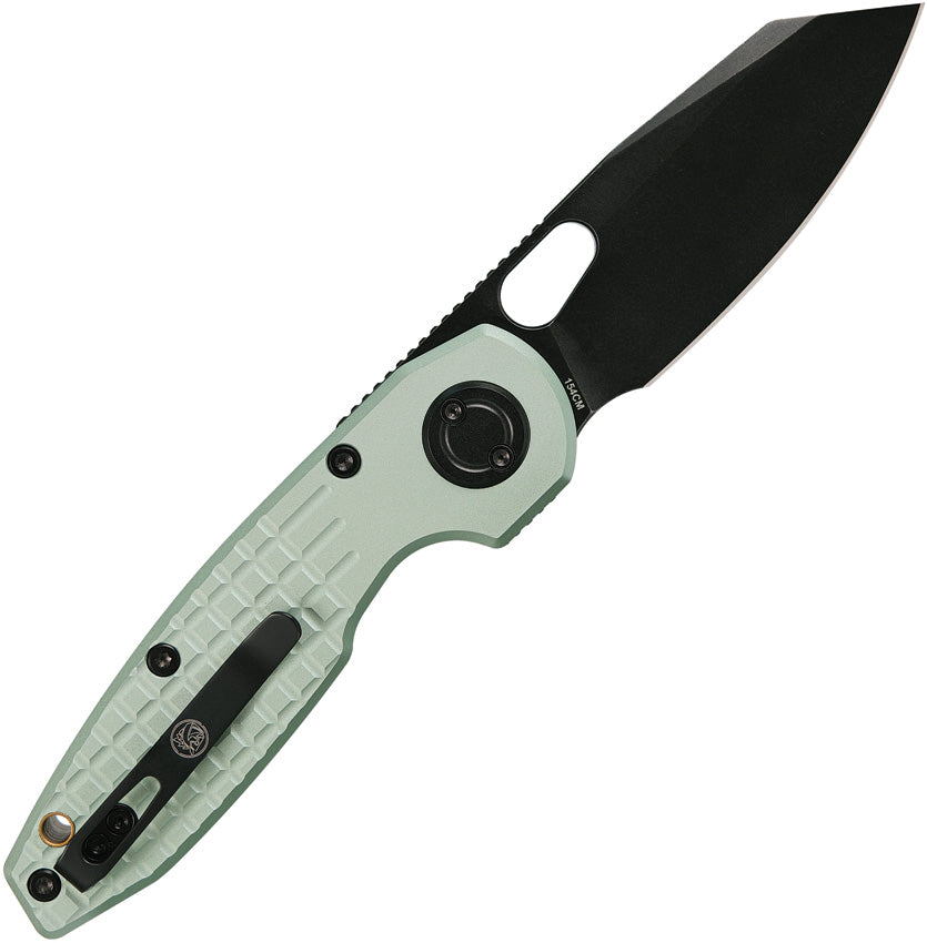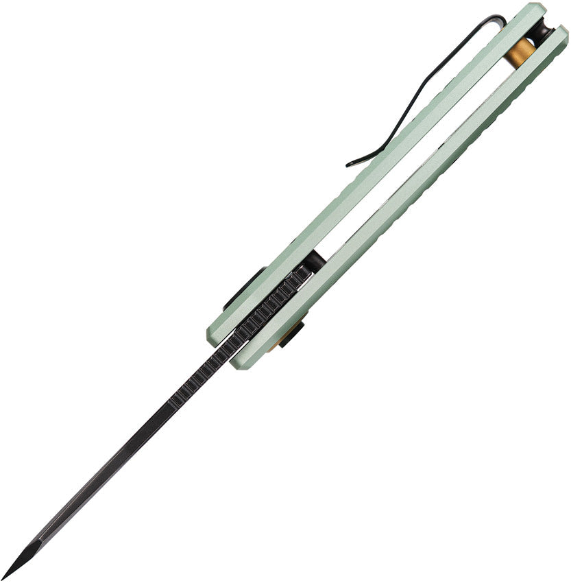 4.5" (11.43cm) closed. 3.13" (7.95cm) black stonewash finish 154CM stainless blade. Green sculpted aluminum handle. Thumb pull. Lanyard hole. Pocket clip. Reverse tanto blade. Black nylon zippered storage case. Boxed.
