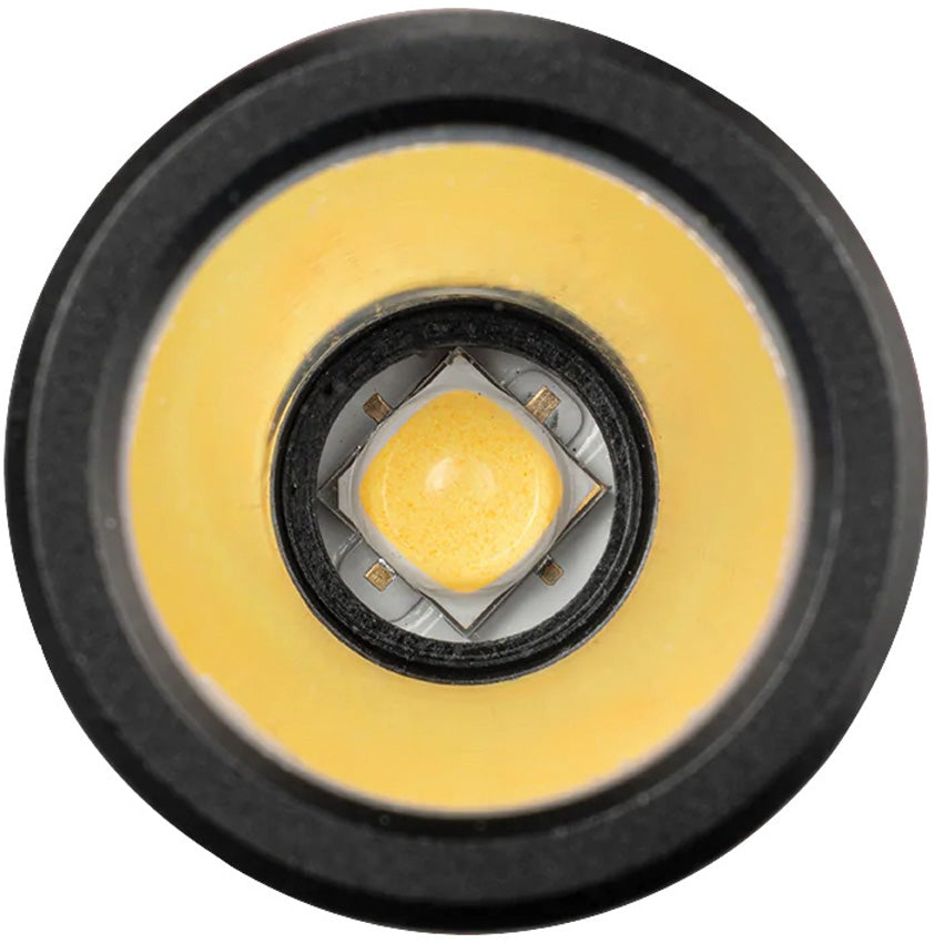 5.3" overall. Water resistant. Impact resistant. Clip. Rechargeable. 315D neutral white LED. Modes: High (650-150 lumens, 1h+1m runtime); Medium (150 lumens, 2.5h runtime); Low (50 lumens, 7h runtime); Moon (1 lumen, 125h runtime). 110m beam distance. Requires (1) Lithium battery (included). Aluminum construction. Color: Black. Boxed with hanging tab.