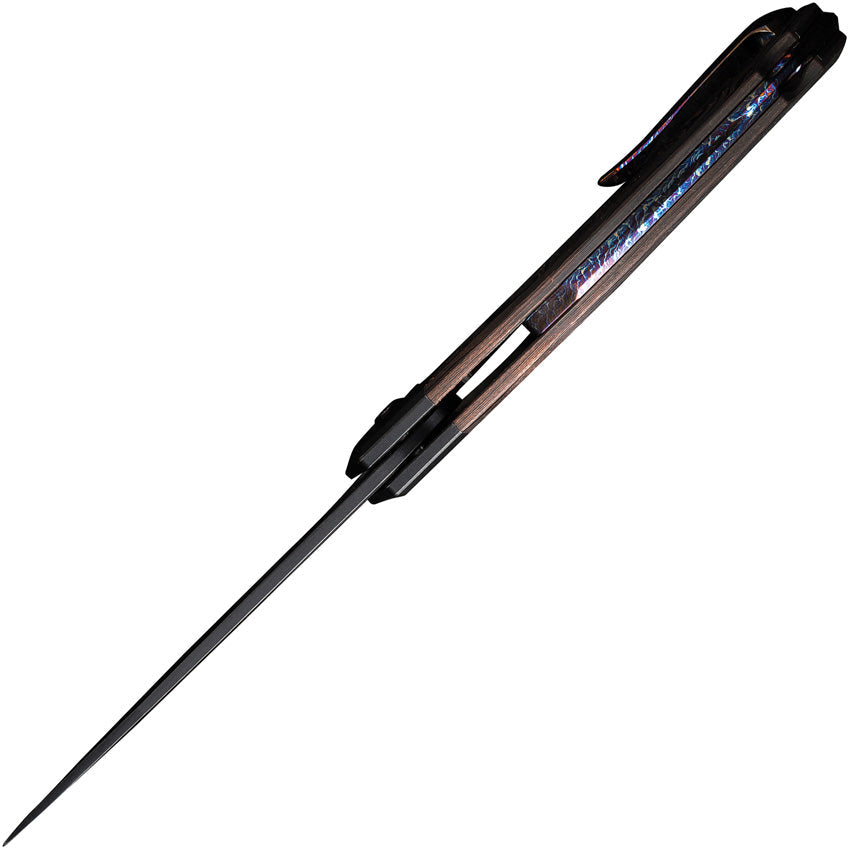 5" (12.7cm) closed. 3.75" (9.53cm) black stonewash finish CPM-20CV stainless trailing point blade. Black stonewash finish titanium handle with Copper foil carbon fiber inlay. Extended tang. Lanyard hole. Pocket clip. Limited edition of 205 pieces. Black nylon zippered storage case.