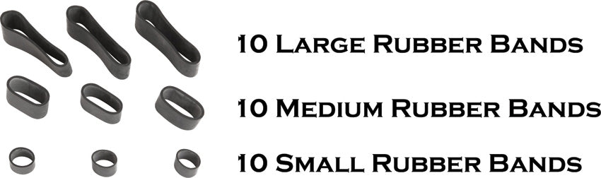 Super strong and durable EPDM rubber bands. Resists cracking from heat, UV exposure and saltwater. Pack contains 10 each Small (0.88" x 0.56" x 0.50"), Medium (1.25" x 0.88" x 0.70"), Large (2.5" x 1" x 1.5"). Color: Black. Hang packaged.